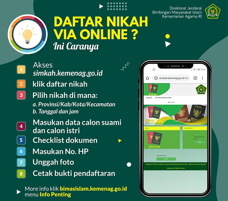 Masyarakat, jelas Muharam, bisa mendaftar nikah secara online dengan mengakses website simkah.kemenag.go.id, dengan melampirkan surat dari kelurahan, tidak perlu lagi surat dari RT dan RW.