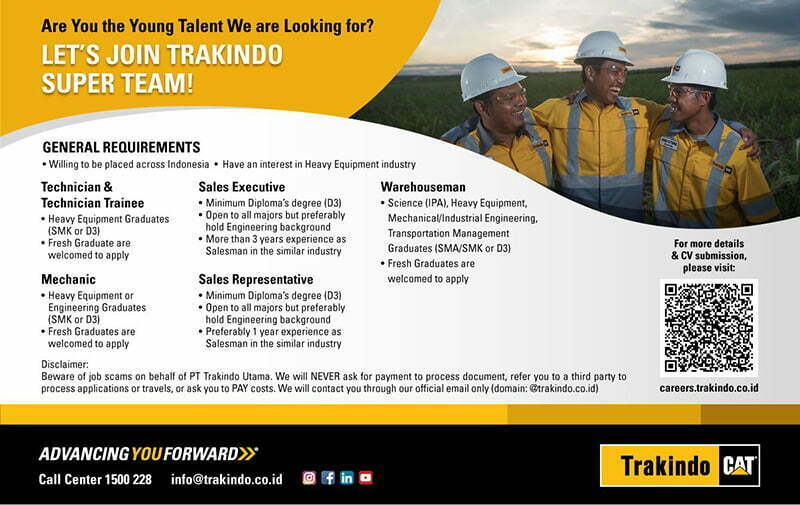 Informasi lowongan kerja hari ini datang PT Trakindo Utama. Trakindo membuka kesempatan bagi kalian untuk mengisi formasi yang tersedia, melalui careers.trakindo.co.id.