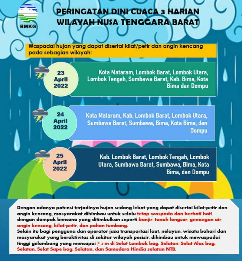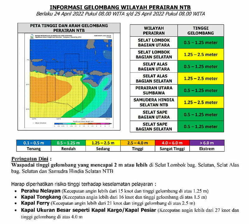 “Diimbau juga untuk mewaspadai tinggi gelombang yang mencapai >2 meter di Selat Lombok bagian Utara dan Selatan, Selat Alas bagian Utara dan Selatan, Perairan Utara Sumbawa, Samudra Hindia Selatan NTB dan Selat Sape Bagian Selatan,” tandas Prakirawan Stasiun Meteorologi ZAM.
