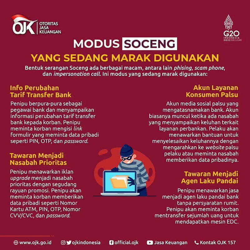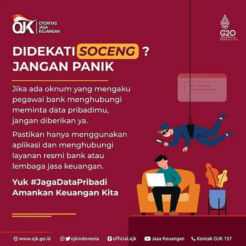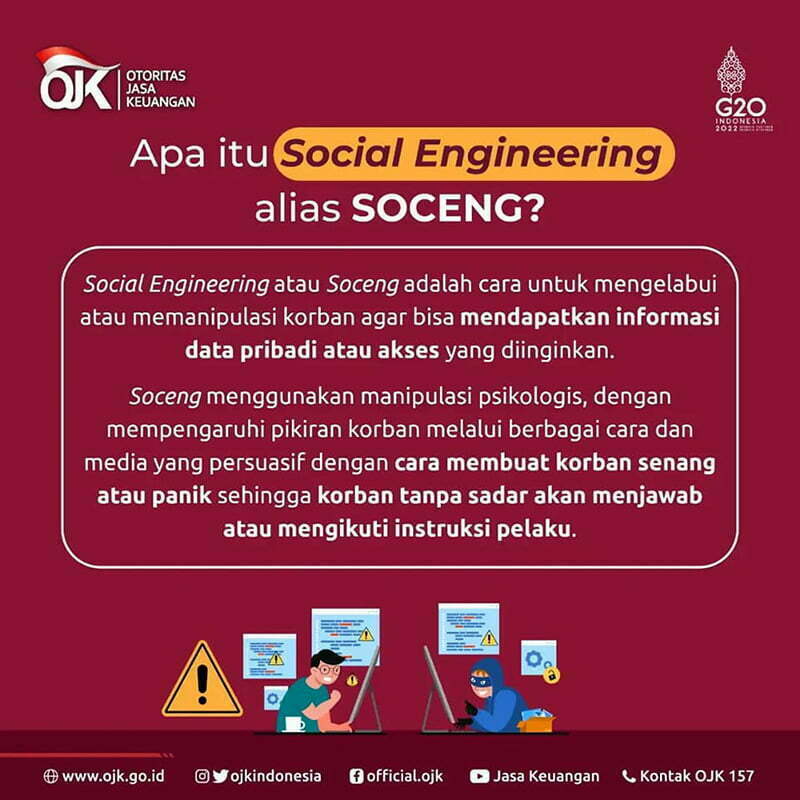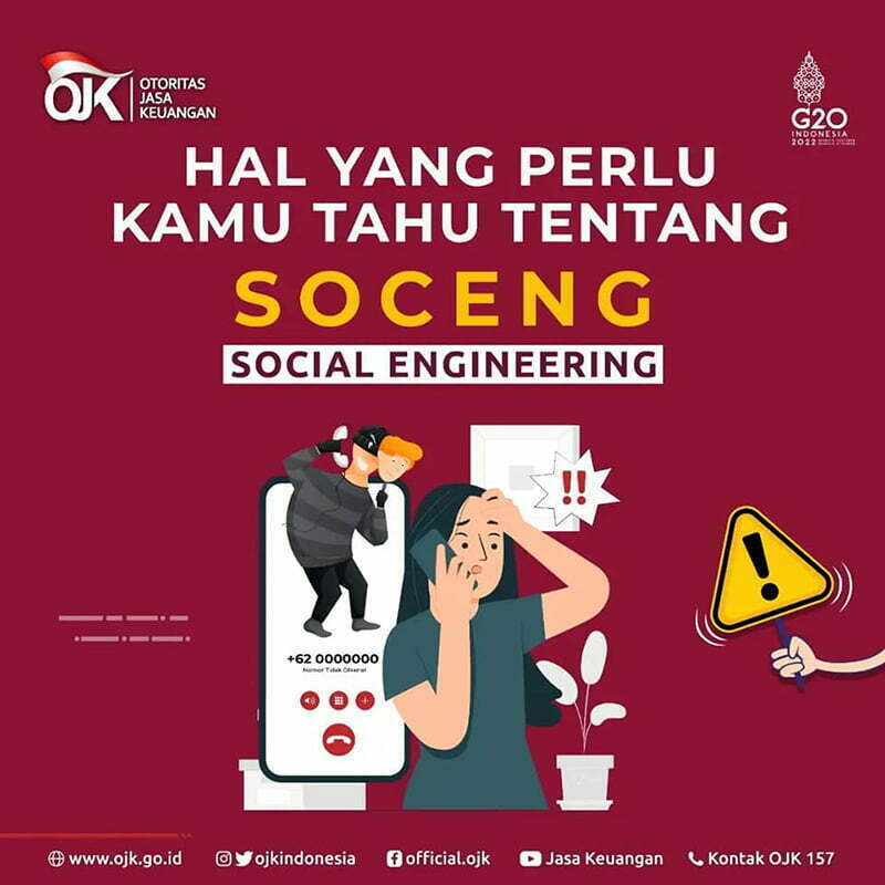 Oleh karena itu, Otoritas Jasa Keuangan (OJK) mengingatkan masyarakat akan bahaya Social Engineering atau Soceng. Soceng adalah cara untuk mengelabui atau memanipulasi korban agar bisa mendapatkan informasi data pribadi atau akses yang diinginkan.