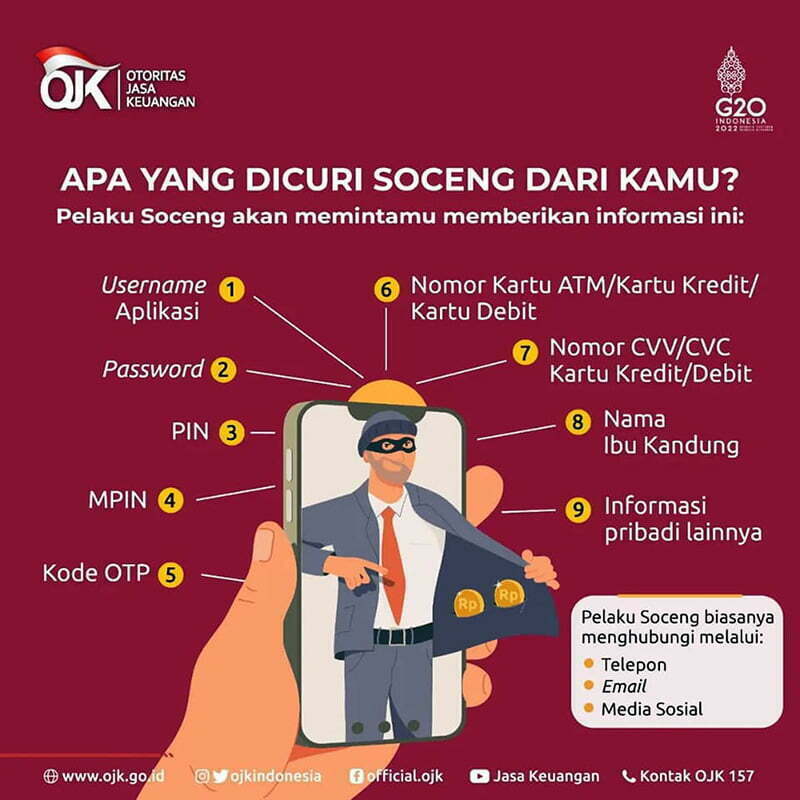“Dibalik perkembangan teknologi yang memberikan kemudahan bagi masyarakat, terdapat banyak oknum tidak bertanggung jawab yang memanfaatkannya untuk kejahatan, salah satunya melalui soceng,” kata OJK, dalam siaran pers, Rabu, (22/6).