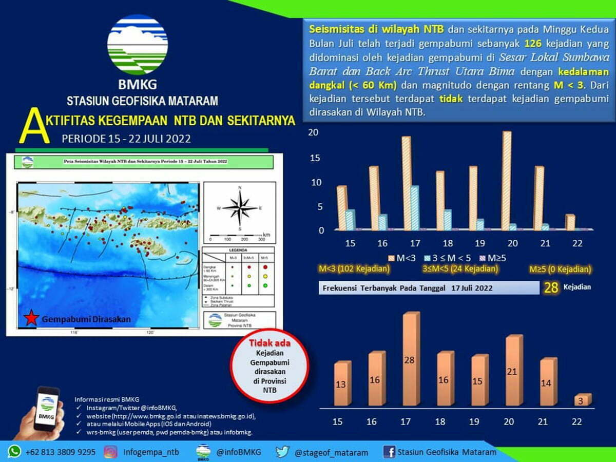 “Adapun seismisitas di wilayah NTB dan sekitarnya yang tercatat dan teranalisa oleh Stasiun Geofisika Mataram pada minggu ketiga bulan Juli Periode 15 – 22 Juli 2022, bahwa telah terjadi gempa bumi sebanyak 126 kali. Dari 126 kejadian tersebut tidak terdapat kejadian gempa bumi yang dirasakan di wilayah NTB,” tutur Ardhianto Septiadhi, Kepala Stasiun Geofisika Mataram, dalam siaran pers, Sabtu, (23/7).