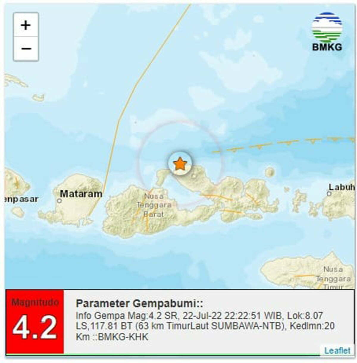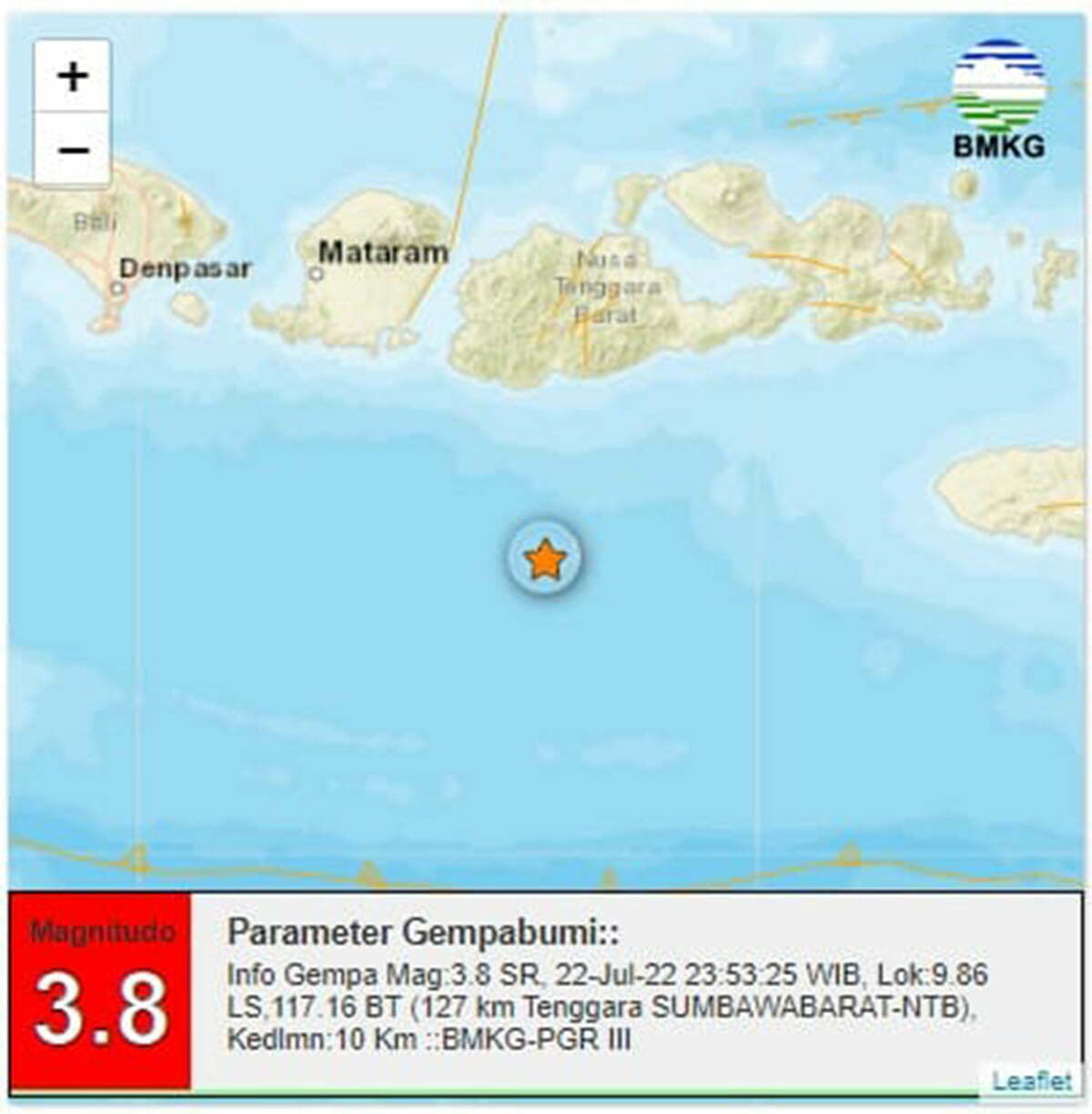 Mataram, KOBARKSB.com – Pada pukul 23:22:51 WITA, Jum’at, 22 Juli 2022, BMKG melaporkan, bahwa gempa bumi berkekuatan M 4,2 telah terjadi di koordinat 8.07 LS,117.81 BT atau 63 km Timur Laut Sumbawa, pada kedalaman 20 km. Disusul pada pukul 00:53:25 WITA, Sabtu, 23 Juli 2022, gempa bumi berkekuatan M 3.8 kembali terjadi di koordinat 9.86 LS,117.16 BT atau 127 km Tenggara Sumbawa Barat, Nusa Tenggara Barat (NTB), pada kedalaman 10 km.