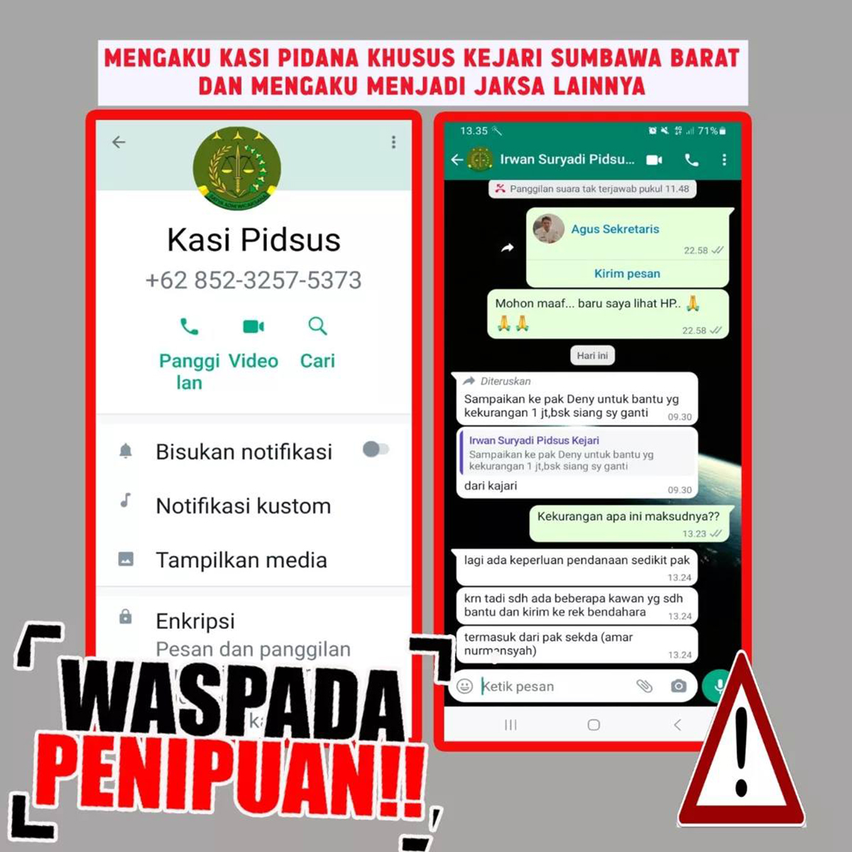 Apabila ada seseorang yang mengaku dari Kejaksaan Negeri Sumbawa Barat, ujar Titin, kemudian meminta uang atau bantuan uang, maka segera laporkan ke nomor HP/WA: 081230230282 atau 087853295062.
