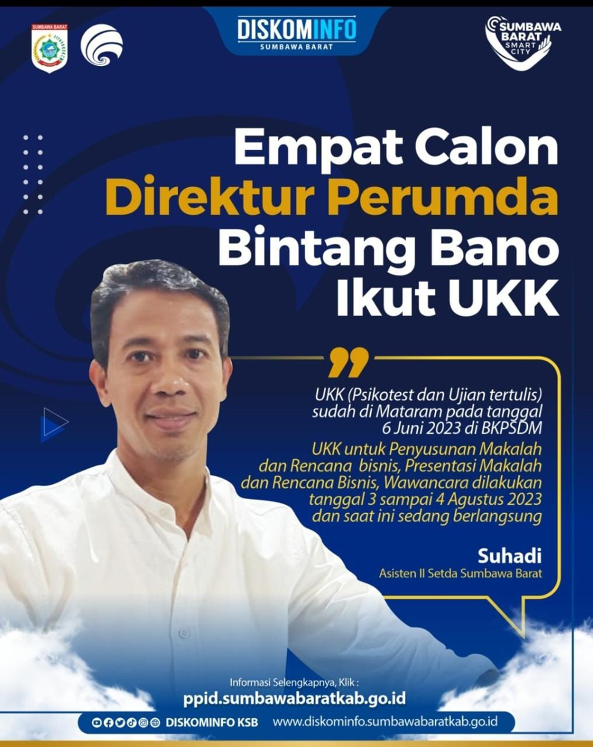 “Seleksi jabatan direktur Perumda Air Minum Bintang Bano kini pada tahap Uji Kelayakan dan Kepatutan (UKK). Mulai tanggal 3 hingga tanggal 4 Agustus 2023, 4 calon direktur akan mengikuti UKK di Mataram,” kata Suhadi, Asisten II Setda KSB, Kamis, (3/8).